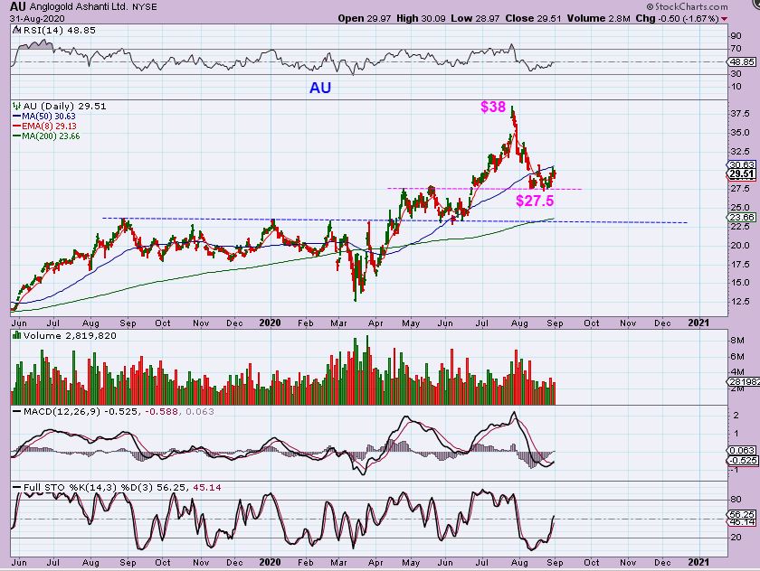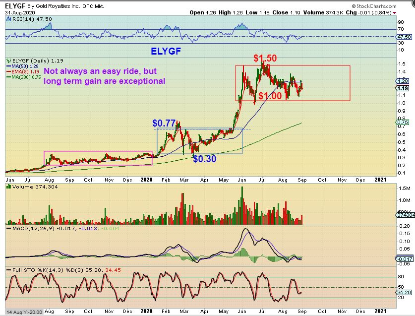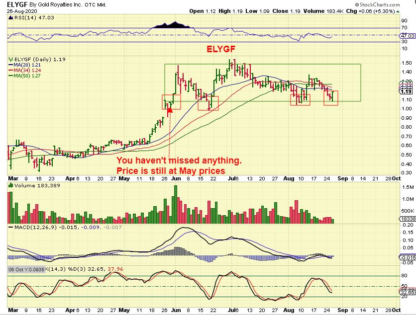 ELYGF –  I actually love this stock, but it too lost $1.50 to $1.00. Miners have pulled back.  If a box consolidation has formed you could buy it low.