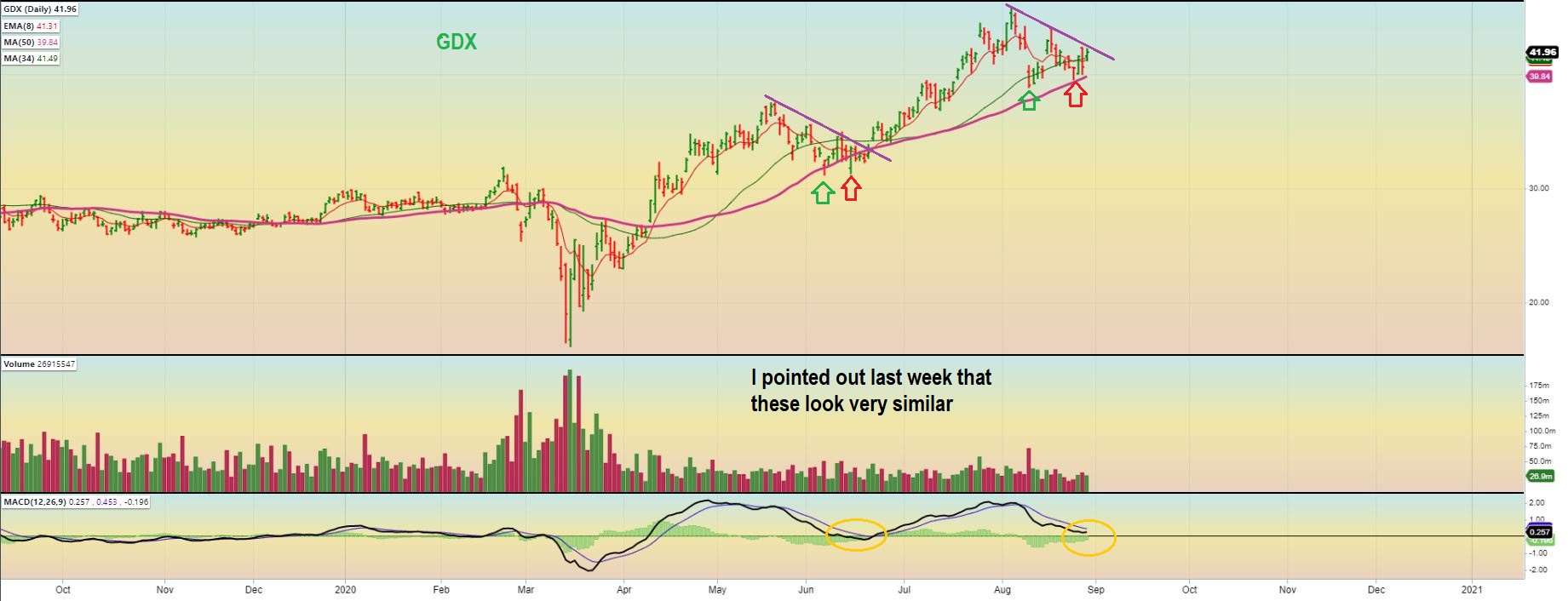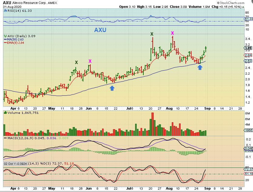 If I ignore that observation, I just look at AXU as a Miner that dropped to the 50sma again, found support, and is moving higher again.  It looks like a bullish repeat of May price action.  So this drop was similar to what it did in May with a double top & drop to the 50sma.