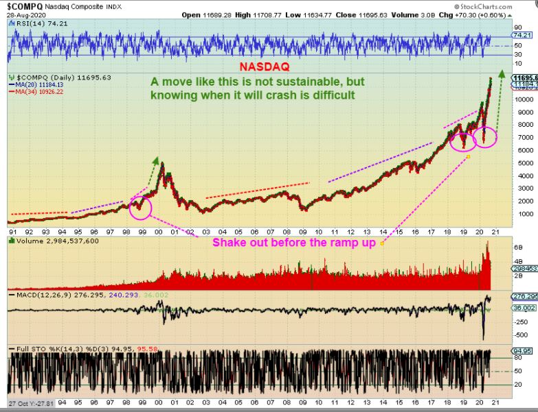 The weekend reports have  reported on the Big Picture as a possible blow off top that ends badly.  Those runaway moves cannot be sustained indefinitely. This looks steeper than the 2000 Tech Bubble, so even though I am long certain positions,  I am cautious the longer this goes on.