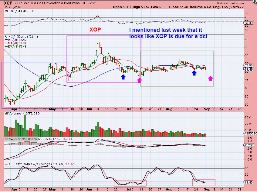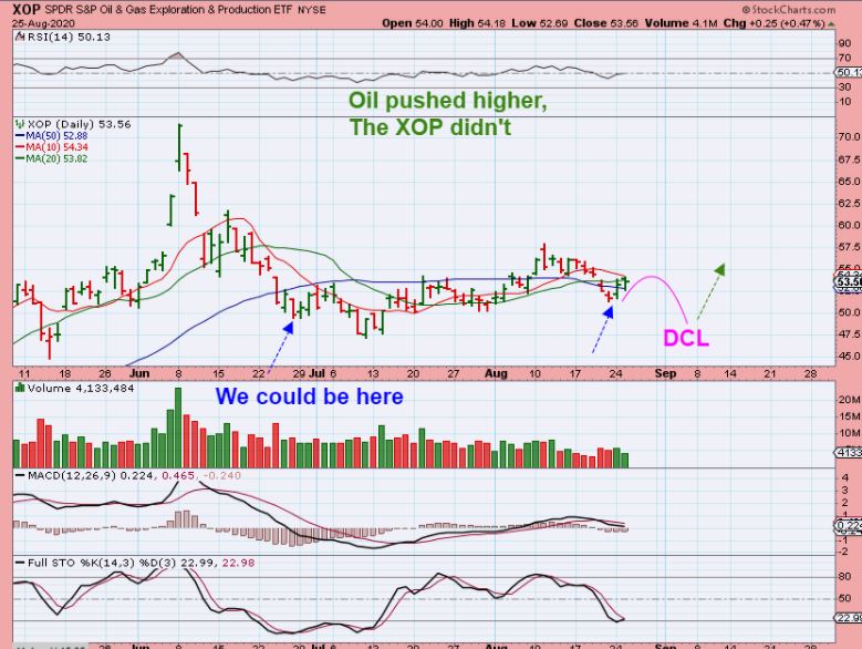 XOP  AUG 25th– I mentioned that I feel that the XOP needs to drop into a dcl, so it was no longer following Oil, even as Oil broke rather bullishly above the 200sma.