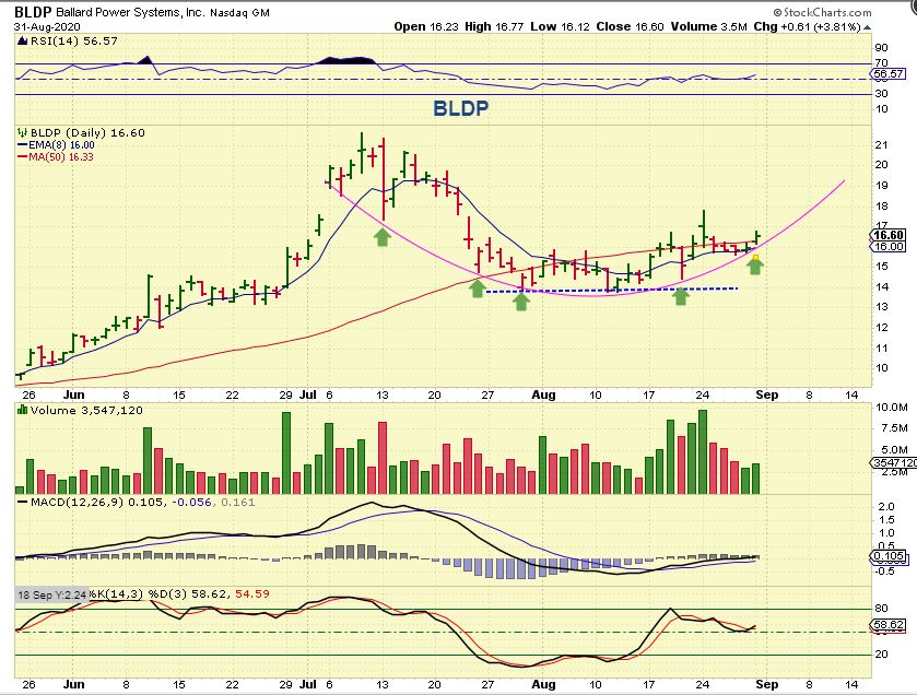 BLDP  – Another swing trade that popped and chopped sideways, but it did push above the 50 sma again on Monday. I’m ready for that run to $21 🙂
