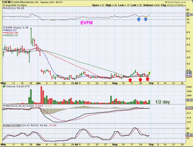 EVFM  – I bought this when I saw the flat base and volume started to build.  This chart was taken Midday and posted in the live area below the report. It closed in this area with twice the volume. I think that it can run quickly if it can get over $3.50.  This is also one of those possible  pop & Drop & pop & Drop , etc bases.