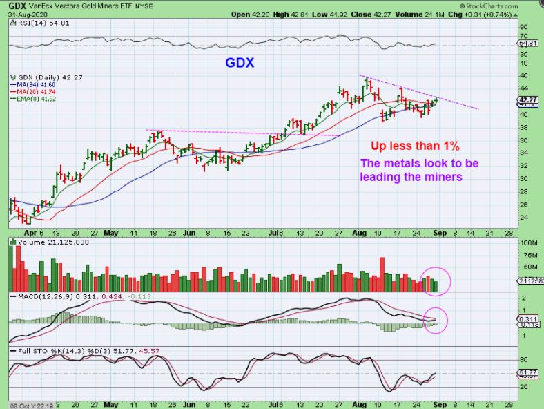 SILVER  broke the downtrend and looks stronger than Gold. That is also bullish, however on Monday I saw many silver miners push higher & then sell off into the end of the day.  That isn’t eerily bearish, but it is worth taking note of going day by day.  Let’s watch the Silver Miners Tuesday.