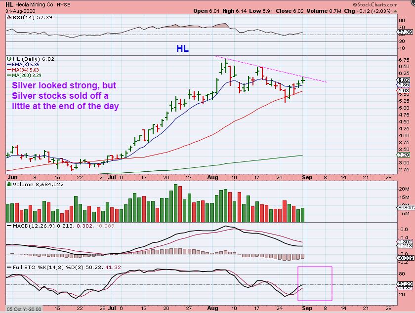 HL  is an example of how SILVER pushed higher all day, yet some of the Silver Miners ran  up & then sold down into the end of the day. Watch for a break of the down trend Tuesday.   If Silver is up Tuesday, we want these to break out.