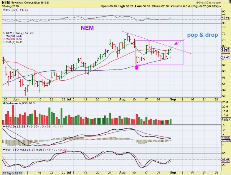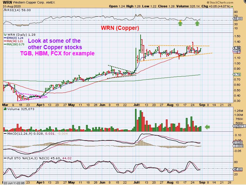 WRN – I bought this consolidation Monday, since HBM, TGB, FCX have had a nice run.  I discussed the bullishness of those Copper stocks in a July report and several have done very well since then.  I would like to see WRN play catch up.