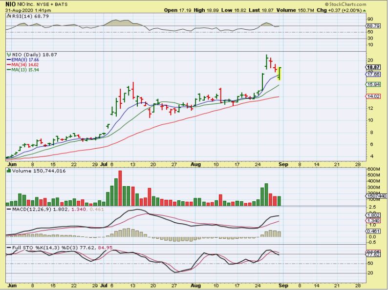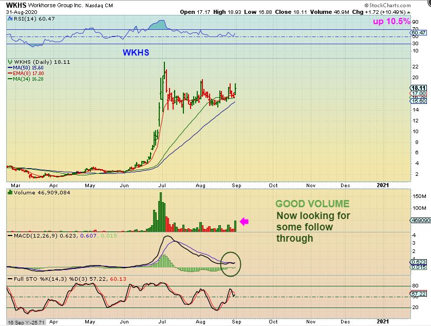 WKHS  – I have been pointing out that I bought WKHS and like the set up / consolidation for over a week now. I said that this one is a ‘swing trade’,  one that you hold for a while until it breaks one way or the other, but it is a bullish set up in a strong sector  ( NIO, TSLA, etc).