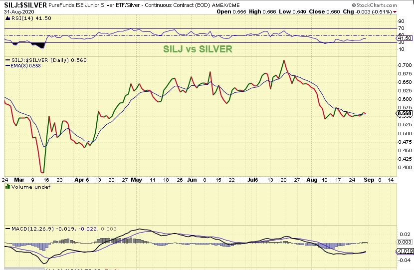 SILJ VS SILVER is actually not bad and the MACD looks promising, so lets see what Silver stocks can do Tuesday & Wednesday. This chart is rather neutral, and GDX vs GOLD is similar.