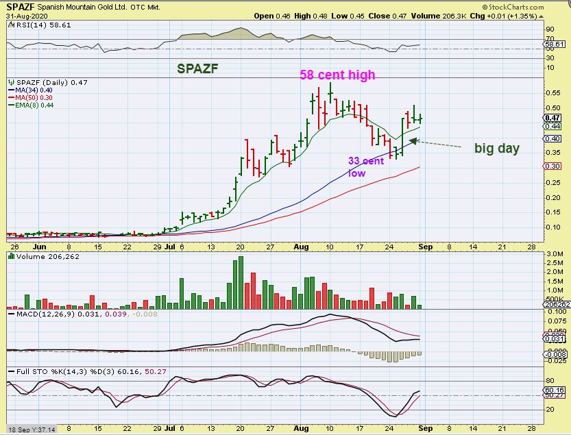 SPAZF is a great little stock too, and it had a strong run from July to August.  It didn’t drop?   It too dropped 58 cents to 33 cents.  Riding that down is big if you own a large portion.    That is over 40% drop from 58 cents just last week.  The STRONG REVERSAL helped recoup the drop,  but it dropped.