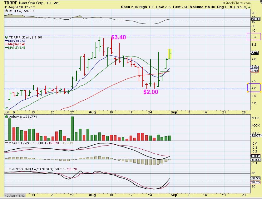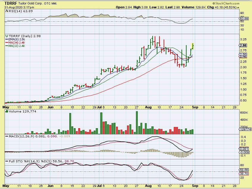 TDRRF  – The big picture of TUDOR is stellar. Buying at May near 50 cents and riding it to $3.40 would have been great, the drop would be giving some gains back, but you’d still be up a lot.  If you started piling in during July however? You made it and gave it all back (  $2 to $3.40, and back to $2.00)  and now its coming back again.