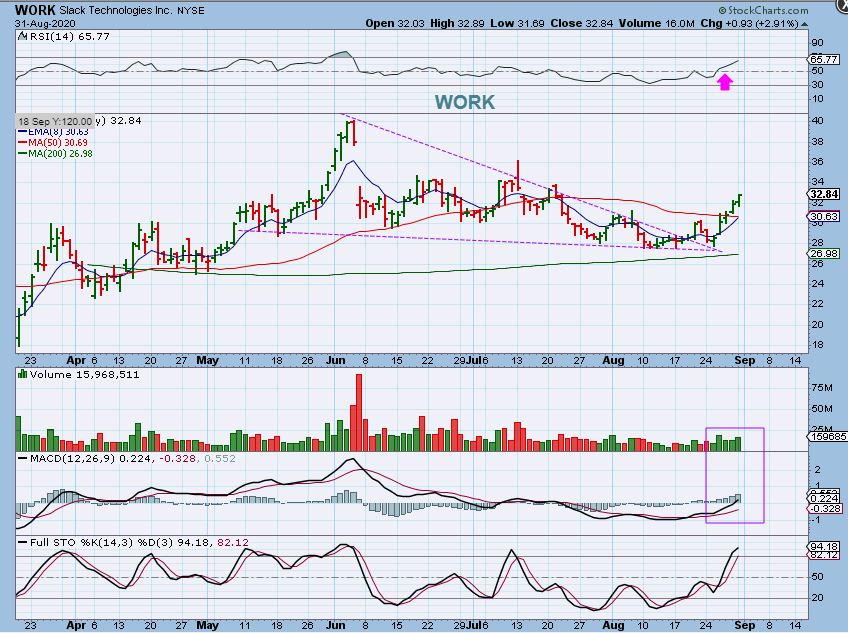 WORK– has broken above the 50sma and looks to be on its way to $40.