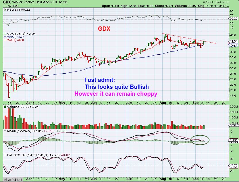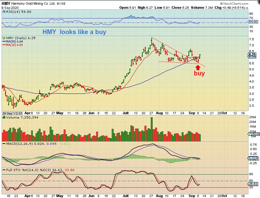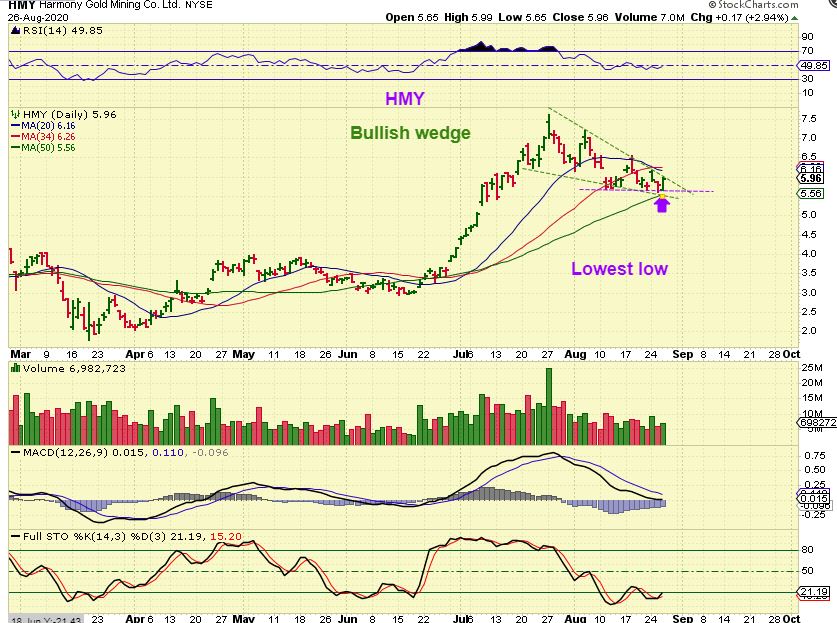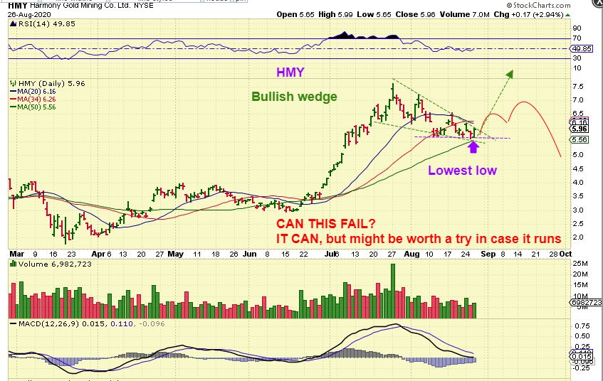 LET ME SHOW YOU SOMETHING ABOUT HMY, AUY, GFI, etc: I posted these as buy opportunities during the choppy pull back 2 weeks ago in August 26. I saw a Bull wedge and it is a low risk buy at the 50sma. SOME MINERS also now look like this, so lets see what happened….