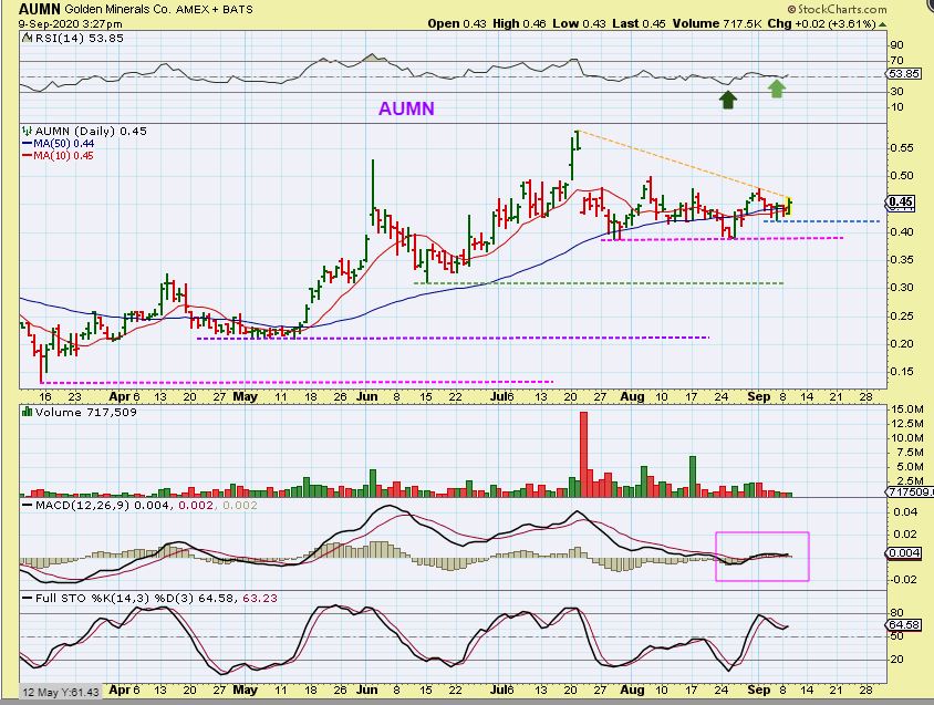 We see that AUMN is still putting in higher lows , even though it has been chopping sideways for months. It lost & regained the 50sma, but I do like the MACD & RSI improvement lately, so the set up remains bullish. WITH BULLISHNESS CAUSING MANY MINERS TO REMAIN GOOD LOOKING, YET CHOPPINESS CONTINUING IN SOME OF THESE, I WANT TO DISCUSS THAT TOO.