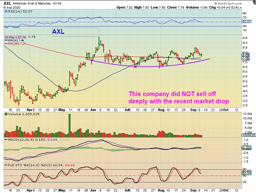 AXL – This automotive company ran from $2.50 to $9.50 and has since been consolidating those gains. When the markets just crashed down, I noticed that AXL did not, so this has been strong and remained that way. I think the lows are in and we are seeing higher lows, now above the 50 & 200sma. It is a buy, though it may chop a little here & there on the way higher ( I do not know when earnings are).