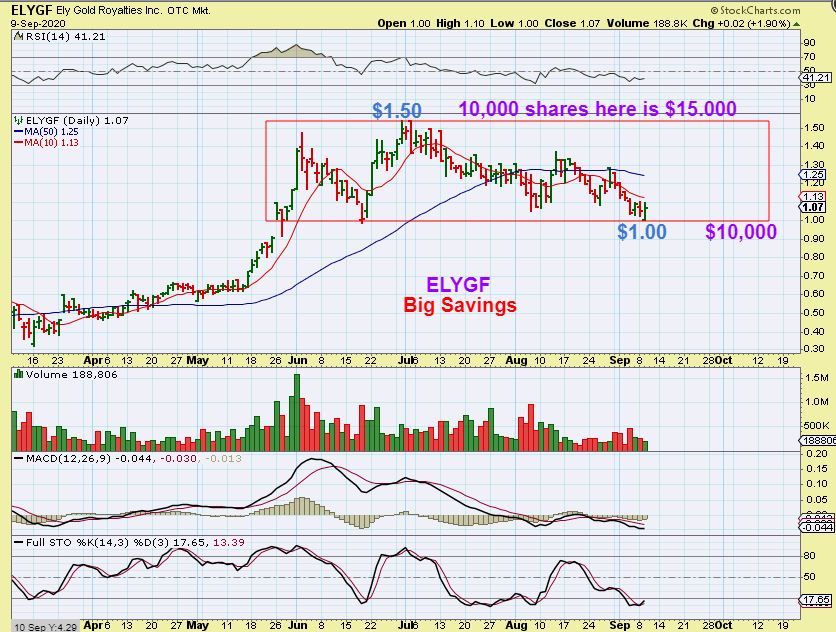 ELYGF – If I own 5-10 of these Miners and just hold through times that I know are a ‘correction’ or ‘pull back’ at the end of an intermediate cycle, this is what would happen to my account. This stock alone would give back $5000 every time it dips to $1. If I own 5 of these Miners? I watch my account drop $25,000, so this is why I would rather sell when I feel an intermediate cycle is getting older & could drop, and I try to buy back lower. It frees up money to trade with too. ELYGF was $1 yesterday.