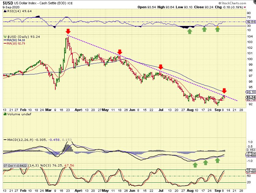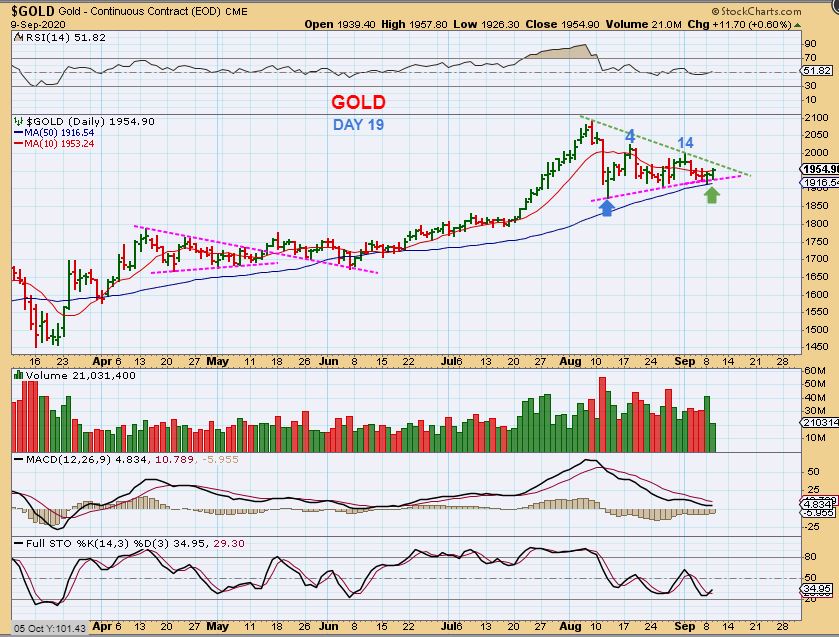 USD – The USD was stopped at the down trend line, and this helped Gold. IS THIS A SHORT TERM SITUATION? We shall see, but if that was a USD ICL, we should break the downtrend and Gold would drop.