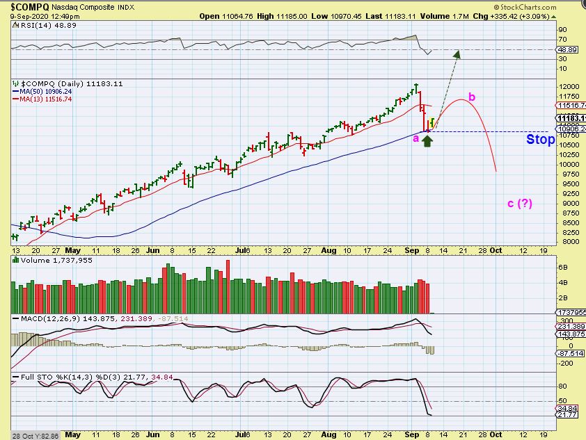 NASDAQ – As a reminder, we still do not know if this parabolic run will just continue ( Green line) or roll over as an a-b-c type drop that leads to an ICL drop. We will watch how things unfold ( weak or strong) and go from there. If this is going to drop, we could go short at ‘b’.