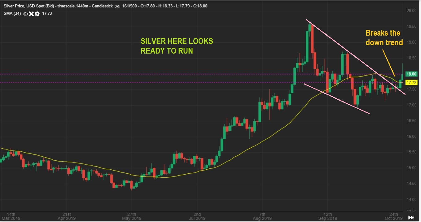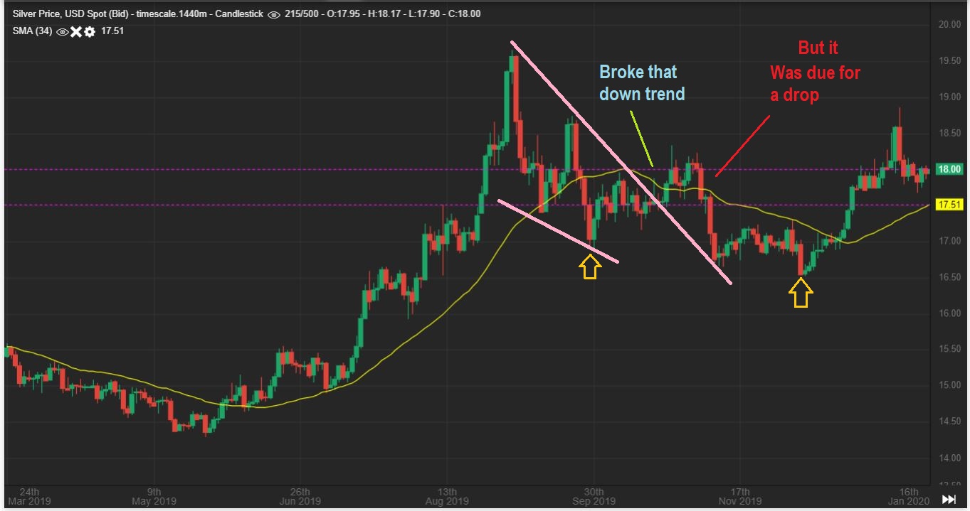 SILVER was due for a drop here after a strong run. So here it dropped and started to look Bullish after forming a dcl. Notice that it even broke out of a downtrend & regained the 34 sma, so it looked like maybe we should buy it. DOES IT NOW RALLY? ..