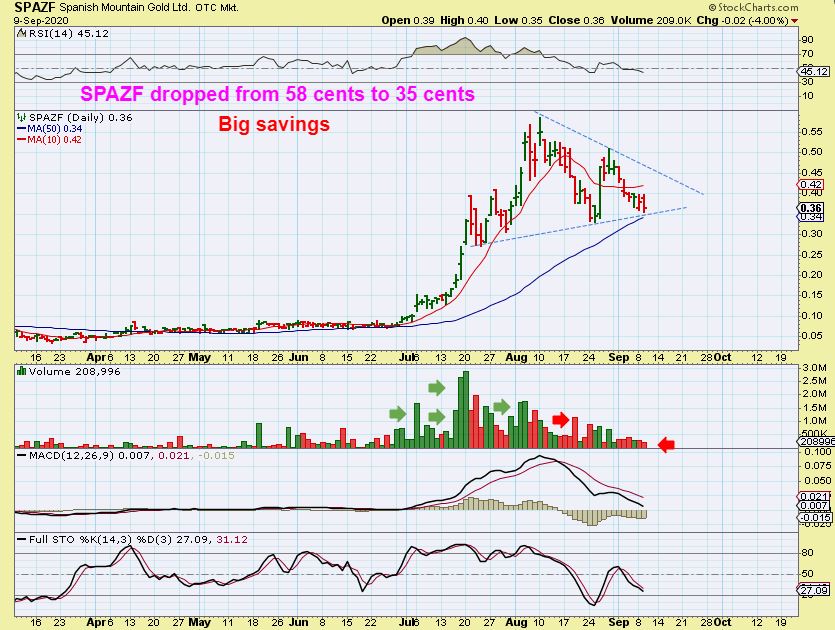 SPAZF – I wanted to own SPAZF, TDRRF, and a few others too, but I wanted to see if it would pulled back 50% of this run. I see that often during an ICL drop. Well, SPAZF has dropped from almost 60 cents to 35 cents, but since some Miners are showing strength, this too may just chop sideways and bounce around for a while with the lows forming in or close to this place. That means that starting a position in this area may be prudent, even though it could go deeper too.