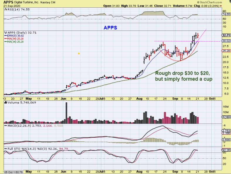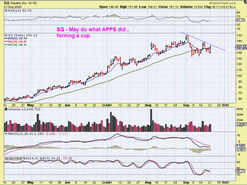 APPS is a bullish chart and ignored the Monday sell off too. In fact, it corrected from Mid August to Mid September forming a cup. I am specifically showing you this recovery pattern ( a cup) to apply it to other set ups. Take a look at the SQ set up for example…