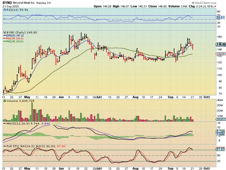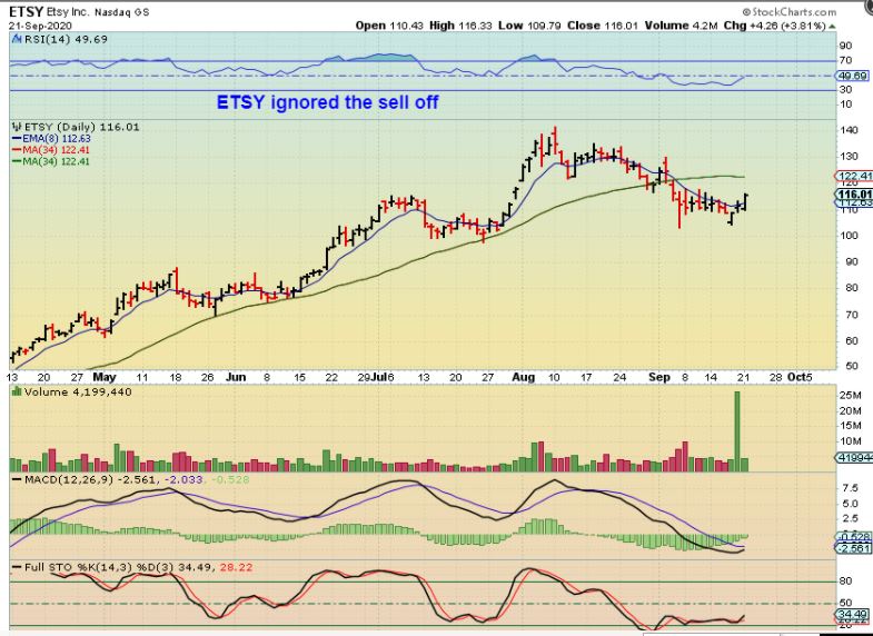 ETSY – I had this in the reports last week, since staying home due to Covid does not prevent inline shopping and ETSY almost tripled since the March crash. Well as you can see, ETSY did not follow Mondays sell down. It is still a buy and we’ll see if it can then regain the 50sma , making this a shake out.