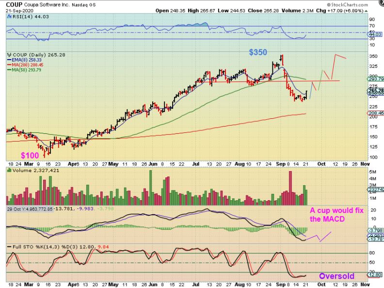 COUP– I feel that IF THE MARKETS do not roll over & Crash, then COUP may do more of a choppy recovery something like this over time. It ran from $100 to $350 since march, so it is a strong company.