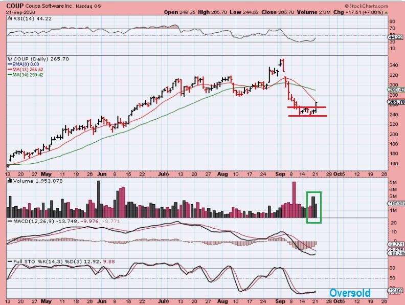 COUP– This is a bit different, because it has sold off with the markets over the past 2 weeks, but it had a surge of buying volume Friday and Monday burst higher. COUP has been strong from the March Crash until now too. It may start to recover with a cup of its own, but since this set up is different, let me show you more of my thoughts on COUP.
