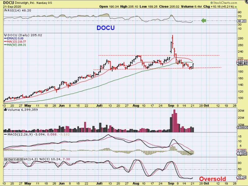 3. Notice that on Monday DOCU no longer sold down. It is back at that consolidation low and it reversed higher.