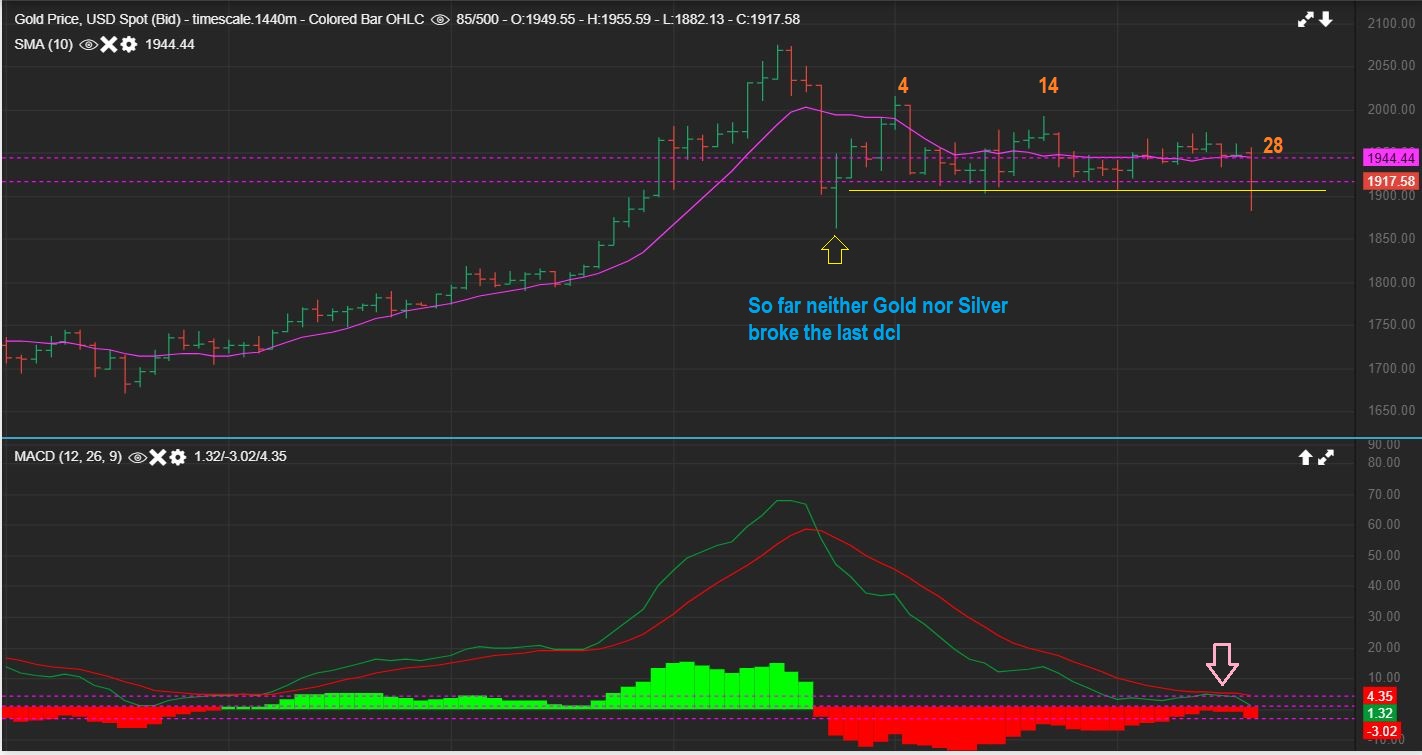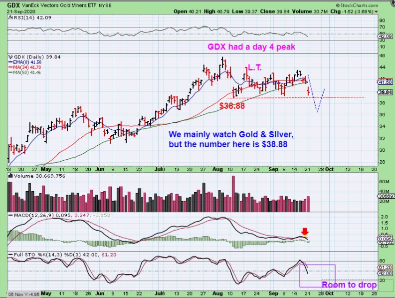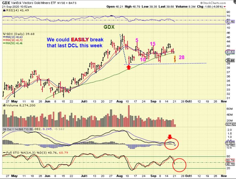 GDX at 11 a.m. dropped 4% and looks like it could easily take out that DCL (red arrow) this week. This was day 28 for GDX and they can be 33 days long, so …