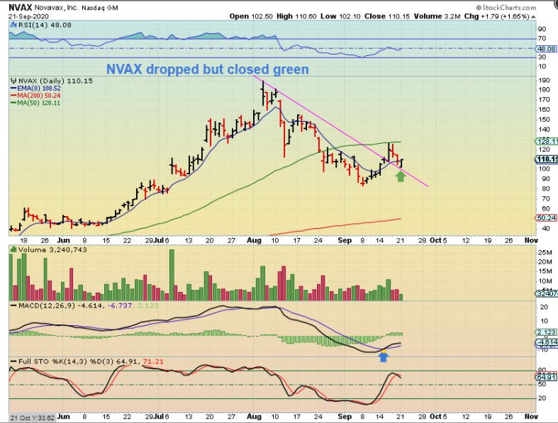 NVAX ran to $130 and has pulled back to $104 Friday. This would be a place that I would add to my position if I bought it earlier . Starting a position here is fine too.
