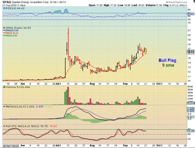 SPAQ — has moved sideways to the 9 sma. Volume is light on the red days, but the buying was strong.