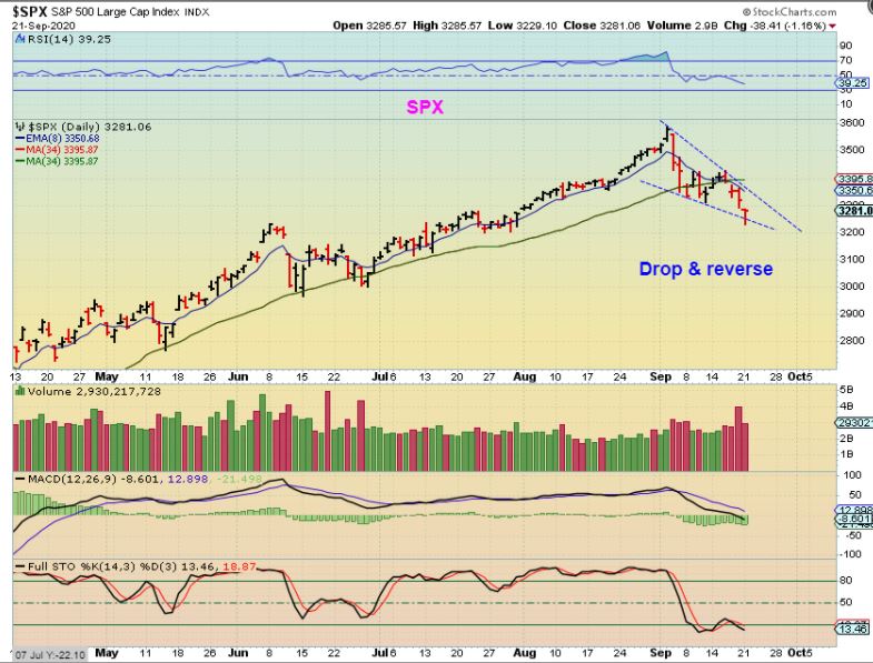 Some of the selling, namely Gold, Silver, and the Miners was overdue so we were anticipating it. Even with the Dow down about 1000 points and the SPX & NASDAQ selling off deeply, some tech & consumer stocks were able to avoid the selling. again, I’ll discuss this at the end of the report, but for now lets get to our review.