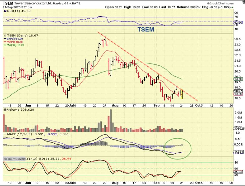 TSEM – Tower Semi bottomed a week ago and it did not sell off Monday either. It even has a bullish MACD and is ready to break a down trend line. That is a buy short term or Swing trade too.
