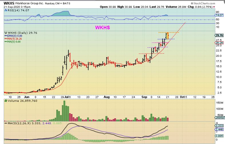 WKHS is still climbing and it hit $30.99 Monday and then dipped down. WKHS has been up, sideways, up, sideways, etc. It has been so strong that the sideways move barely tags the 9 sma.