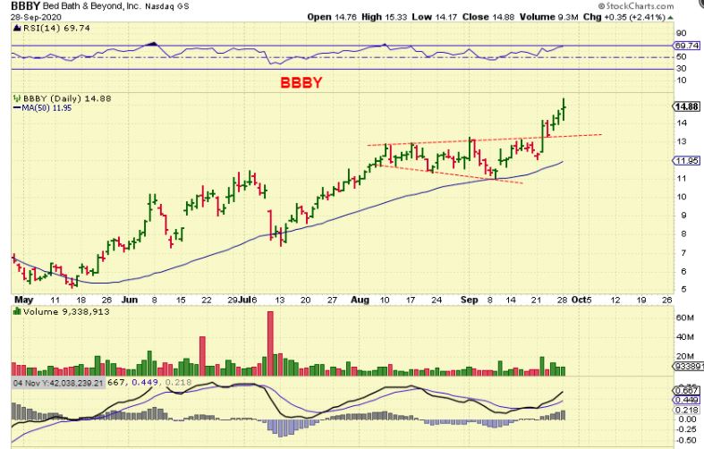 BBBY was in a report last week, it is getting follow through. I would use a trailing stop and if you went in heavily you can always sell a little on the way higher. AS A TRADER, I see the volume lightening up and would expect a possible back test of the red line, so I would have sold some.