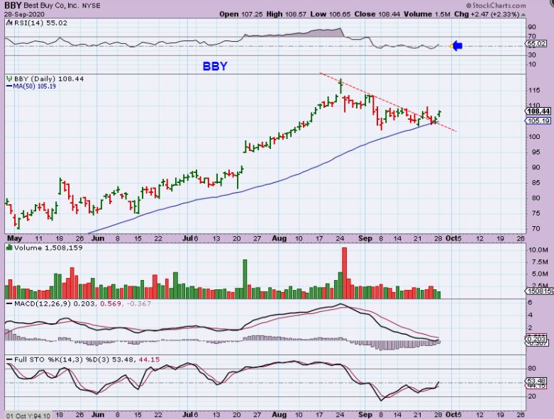 BBY was also mentioned last week and remains above the 50sma. This one is actually still a buy, but you may want to see when earnings are due or may have already been released on any stock that you buy before buying.