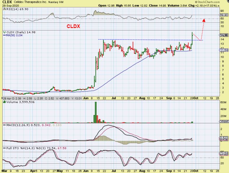 CLDX DAILY – I bought this break out yesterday and this could make a run similar to the first run higher, BUT … the volume did not increase as much as I hoped on a break out. I am now going to be looking for either an increase of volume or a pull back. A Back test to $14 can be bought ( put on your watch list?) or a small starter can be taken here and add if it continues to act correctly. This is a nice break out from a bullish consolidation.