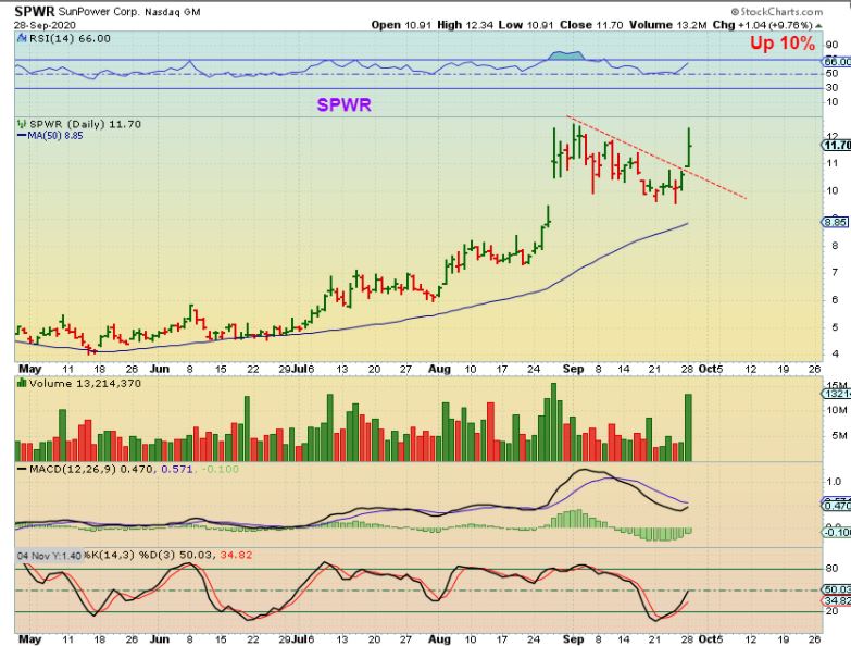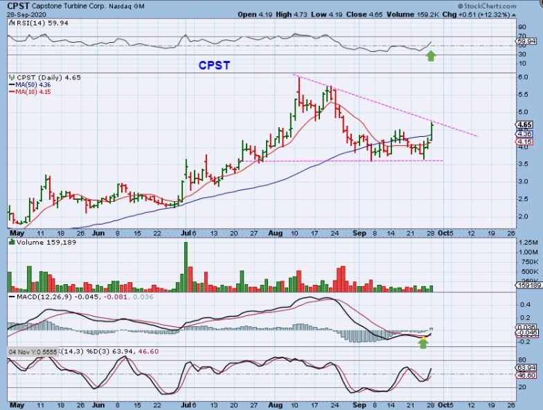 CPST -I mentioned this as a buy in the comments yesterday when it was up and breaking out above that 50 sma. Now it becomes trickier because it closed up 12%, but this did run from $2.50 to $6 in July/August, so it can run higher.