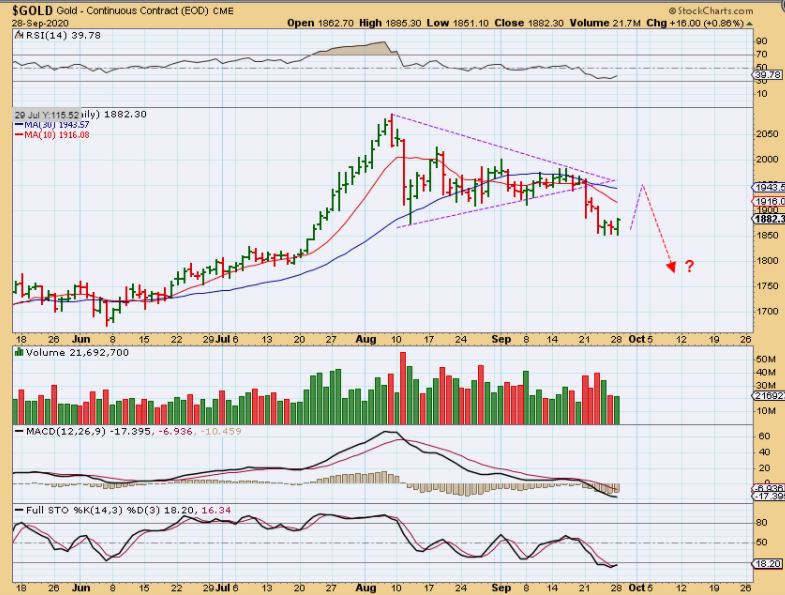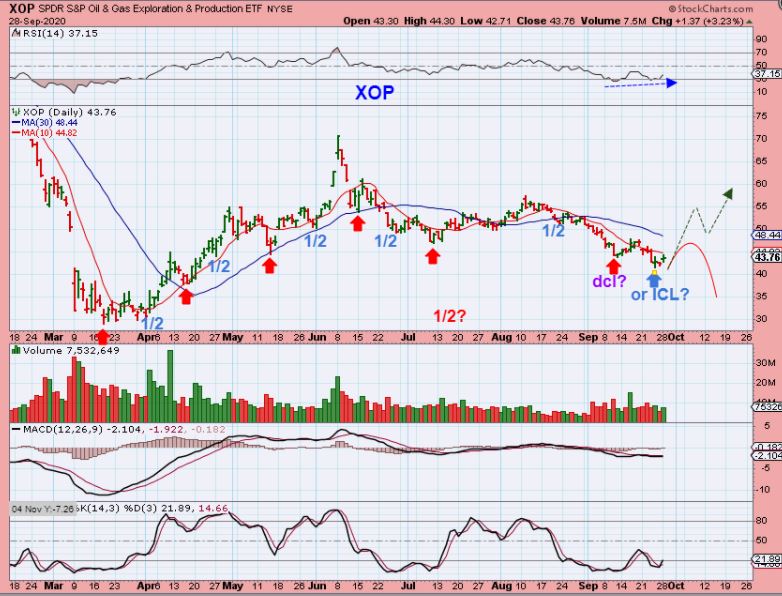 Notice how in March through July it is fairly easy to see dcls and small minor dips that I’d call 1/2 cycle dips. Julys deeper dip broke the June dcl, so now we should get lower lows ( lower dcls) as it seeks out the ICL. With that, I couldn’t label another dcl until I got that lower low, but the XOP rallied in August & then rolled over, so that took 2 months. Now where is that next dcl (low)? Is it also an ICL or will this keep dropping? We need more time, but this has been 6 months from the last ICL.