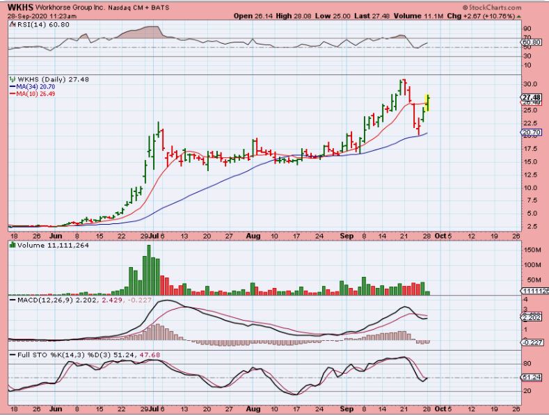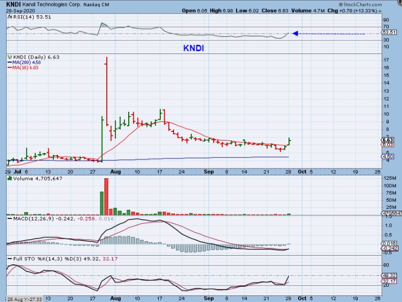 KNDI – I have traded this one in the past and it can move quickly. It has also popped from $5 to $7 recently, and dropped back down. As a day trader ( Scalper), you can put this on a watch list and use intraday charts to scalp trade if it continues to react to the market action.