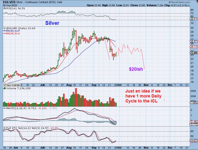 SILVER also popped on Monday as the USD dipped. Another choppy daily cycle? I discussed a possible drop to the 20 area over time.