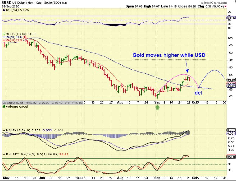 USD – In the weekend report I discussed a possible inverse relationship between the USD & GOLD. As the USD dipped Monday, Gold popped.