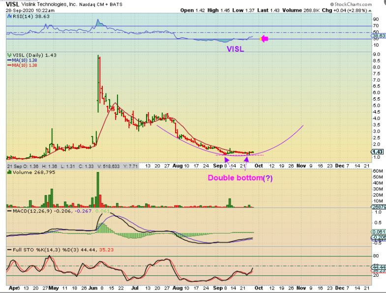VISL – This is a double bottom set up with a rising MACD & rising RSI . It is probably on the ‘riskier trade’ side, since it not showing a solid sign of strength yet, but a stop can be placed right at the lows. I bought it last week since many of these former runners are setting up like this and rising up again to make a higher low ( See 2 or 3 month daily charts of RGLS, BIOC, NOVN, BNGO, etc).