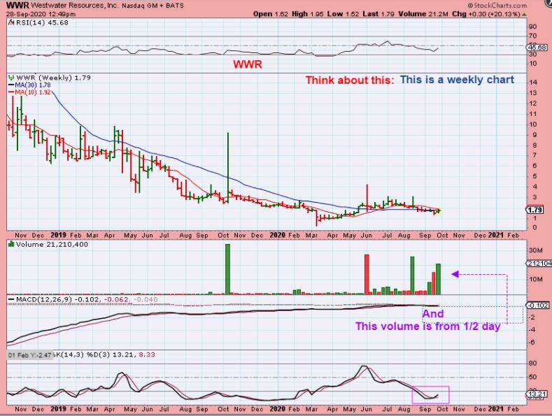 Yesterday I was discussing WWR in the Live area. Why? I mentioned that I bought it ( I said that I bought it 3 times actually), because this volume was Very Compelling. This is a weekly chart and by midday Monday we had 21 Million? I drew this chart midday, So..