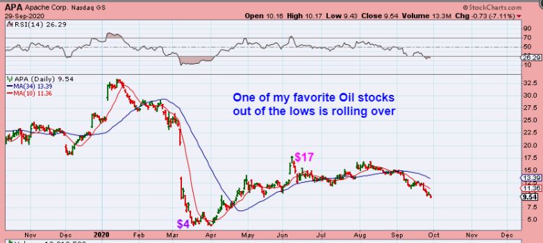 The good news? Various Oil Stocks that ran out of the lows from $4 to $17 and $2 to $8, and so on. When they bottom again, we may grab some of these again for 100-500% gains if they are not going BK by then. This oil company Apache Corp, for example, could lead to a double bottom.