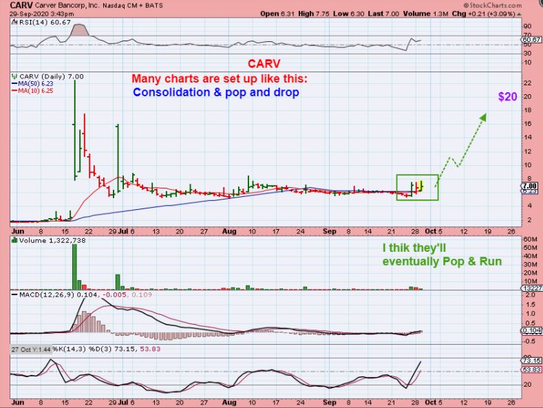 CARV (By the way , this is a tad bit of a higher risk trade set up with these big swings) I think that this & other set ups like it could eventually launch higher from the consolidations. The swings are very big and hard to ride. Tuesday also saw this go from $6.30 to $7.75. I bought it because that was a drop to the 50 sma at $6.30 & reversal. I think this can run BIG if if if it gets the right catalyst. And…