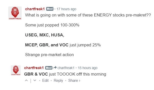Oddly enough: USEG ( Oil & Gas) was up 250% at one point. MXC was up 50% at one point ( Oil and Gas) . HUSA ( Nat Gas and Oil ) was up 500%+! WHAT?? And there were several more too. GBR, VOC, GEVO, etc.