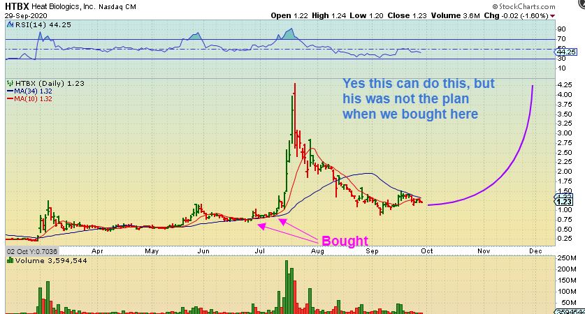 Some told me that they are still holding HTBX or NOVN, or CHFS, and ask , “Will they recover”? Sure, they might actually recover over time, and some are even popping and setting up a higher low now, but this was not the original purpose of the trade. When I point out a ‘trade set up’ like KNDI, CARV, UONE, etc —THESE are also not intended to be long term BUY & HOLD set ups- they are shorter term swing trades. Sell that big run up if we get it and then you can always buy again later if it drops and sets up again.