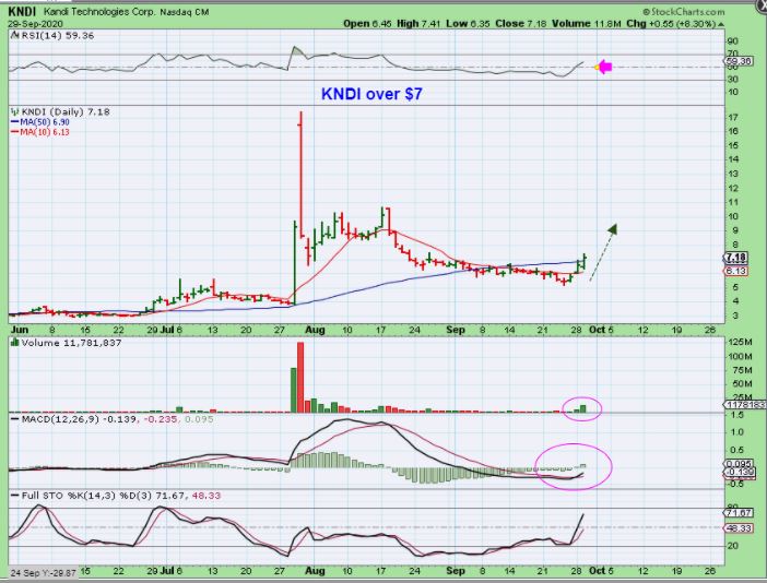 KNDI ( Chinese Elec car / Battery sector) was up another 8% and struggled with the 50sma. Volume increased, the RSI crossed 50 and the MACD looks to be crossing. I bought this under $7 too, simply because I think this could easily run higher from this set up.
