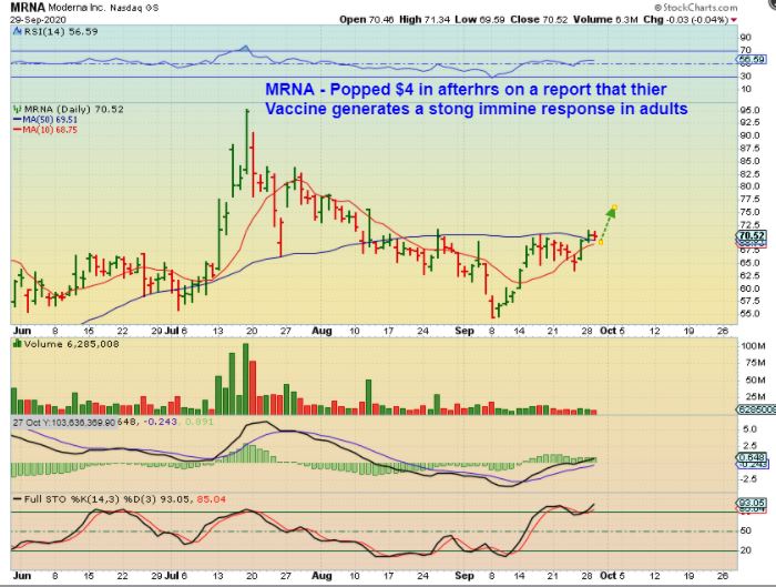 MRNA was recommended recently and it may gap open, since it shot up $4 after hours after releasing a positive news headline, see the chart. It has gained the 50 sma.