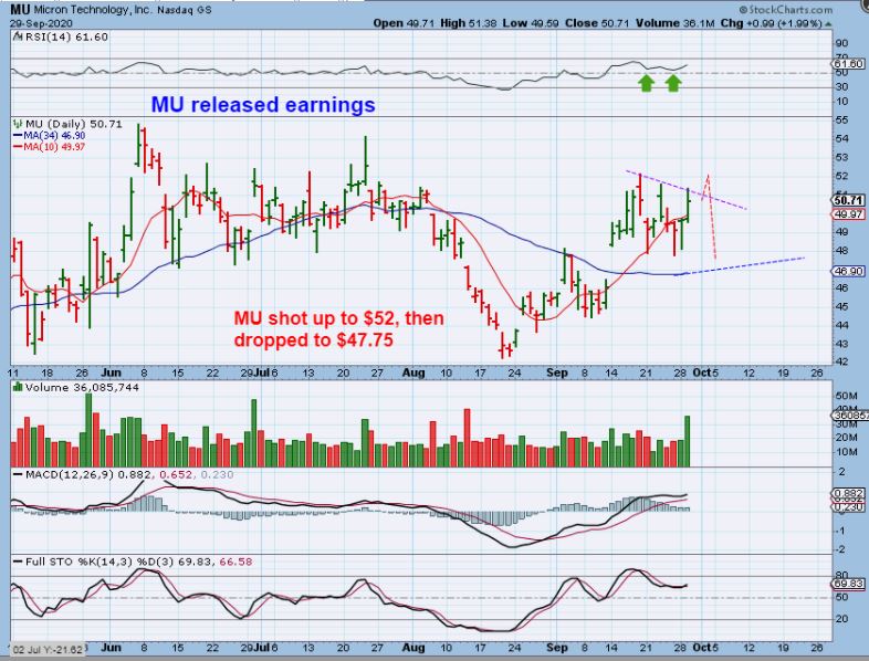 MU came out with Earnings Tuesday after hrs. It actually shot up for a while and lingered at $52, but then it sold off to the $48 area. I drew that path here, so MU should gap down Wednesday, but that doesn’t mean that it will keep selling off. The question is ‘WILL THAT AFFECT AMD?’ We’ll see. As for MU? It may now do a gap fill to the 50 sma.